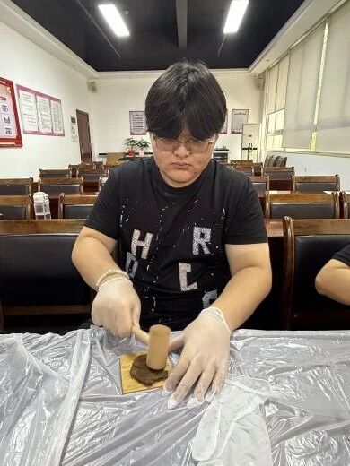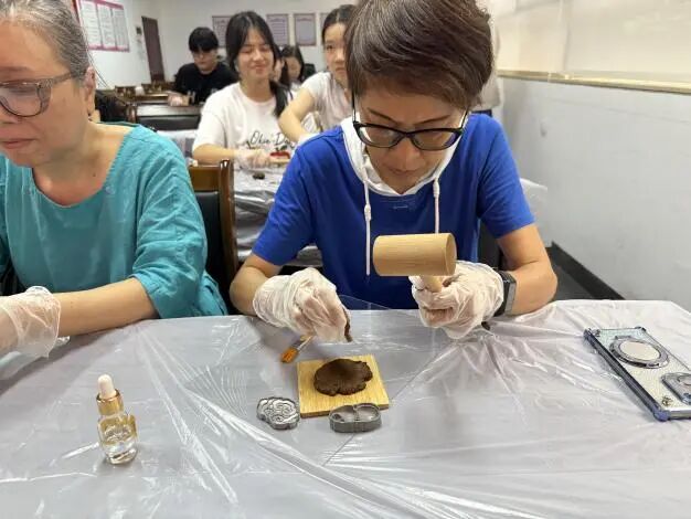 体验环节中,大家按照“醒粉、调香、敲打、入模、成形”等传统工序,将蕴含二天油的药泥精心调配、反复揉捏,最终压制成一枚枚造型别致、药香清幽的香牌。