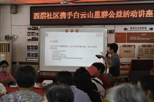 健康讲座是本次公益活动的核心环节。西滘社区医生围绕季节交替期间的疾病预防与养生保健,重点讲解了“科学预防两热(登革热和基孔肯雅热)”与“清热祛湿凉茶养生”两大主题。针对气温回升、蚊虫增多的情况,社区医生详细介绍了蚊媒传染病的传播途径与防范要点,提醒居民做好居家环境清理和个人防护。同时,结合岭南地区湿热气候,深入浅出地讲解了凉茶养生的科学原理与实用方法,倡导“未病先防”的健康理念。现场座无虚席,互动积极,氛围热烈。居民们认真聆听、积极提问,讲座氛围热烈而融洽。