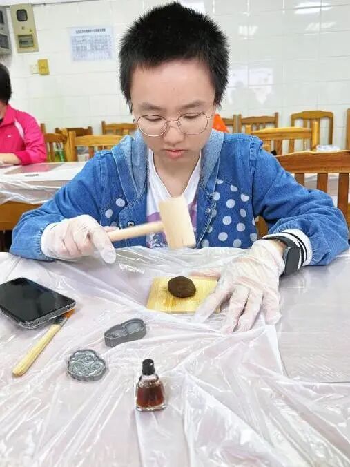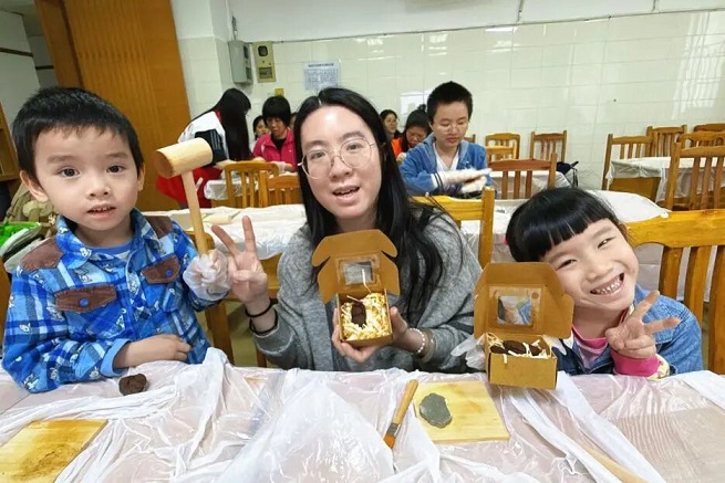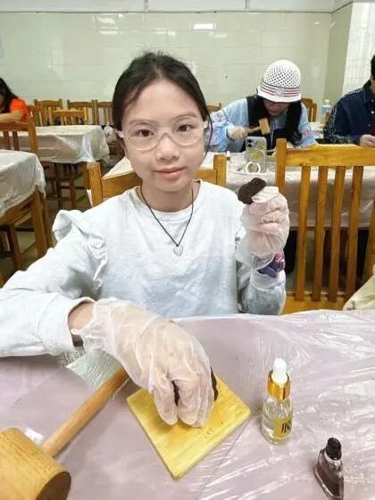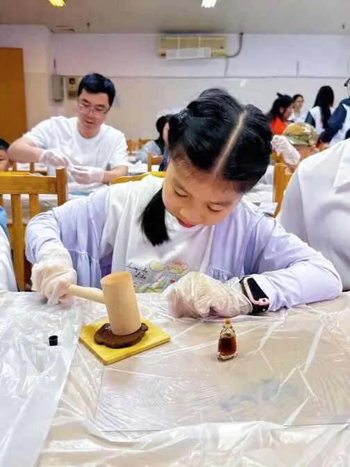 在制作药油香牌环节中,大家化身为非遗传承的“手艺人”。将星群二天油滴入调配好的中药泥团,再将其揉、捏、按压、定型……二天油的独特药香随着指尖的温度缓缓散发,看着自己亲手制作出的药油香牌,大家收获了满满的成就感。
