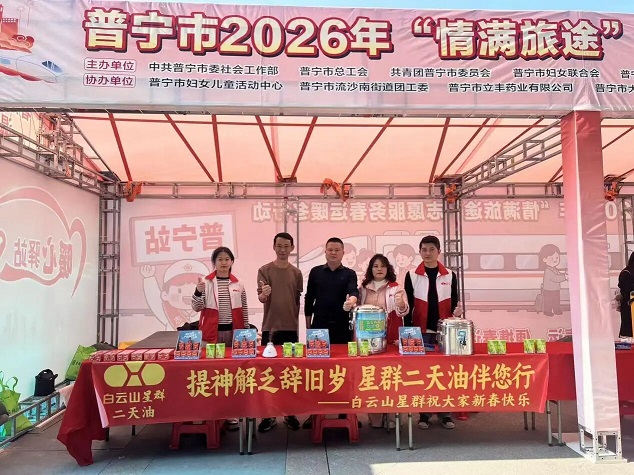 在广东普宁高铁站,星群公司携手立丰药业,联合普宁总工会、团委等部门开展公益活动。“请拿好这份二天油,旅途疲惫、舟车眩晕时,涂抹在人中、太阳穴就能缓解。”身着统一服装的星群志愿者们,在人流密集的候车区设立服务台,为过往旅客送上星群二天油试用装,并提供健康出行咨询。除了派送二天油,志愿者们还协助引导客流、解答出行疑问、帮扶老弱旅客。这场多方联动的公益活动,让春运不仅有“速度”,更添“温度”。